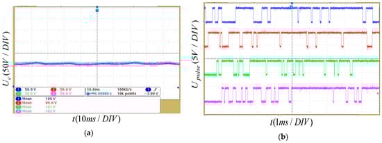 To evaluate the effectiveness of the proposed auto-optimized capacitor voltage balancing method, a different capacitance target deviation was used to control the SM capacitor voltage. Figure 10 shows the SM capacitor voltages and trigger pulses with capacitance target deviation of 5.0 V. The corresponding average switching frequency of the SM is 2060 Hz, and the maximum voltage deviation of the SM compared to the rated voltage (100 V) is 2.6 V. Compared with the former two algorithms, the capacitance voltage deviation between SMs is reduced. The SM capacitor voltage balancing results with the capacitance target deviation of 3.0 V and 0.5 V are shown in Figure 11 and Figure 12, respectively. When the capacitance target deviation is 3.0 V, the corresponding average switching frequency of the SM is 2780 Hz, and the maximum SM voltage deviation compared with the rated voltage (100 V) is 1.7 V. When the capacitance target deviation is 0.5 V, the corresponding average switching frequency of the SM is 3500 Hz, and the capacitance target deviation of the SM compared with the rated voltage (100 V) is 1.0 V. The specific data is shown in Table 4. It can be seen from the comparison of the above experimental results that the auto-optimized equalization algorithm proposed in this paper can not only reduce the capacitance voltage deviation between SMs but also reduce the switching frequency of SMs.