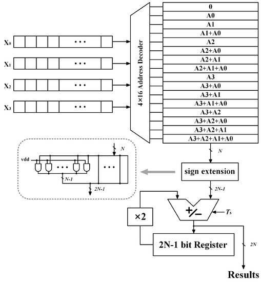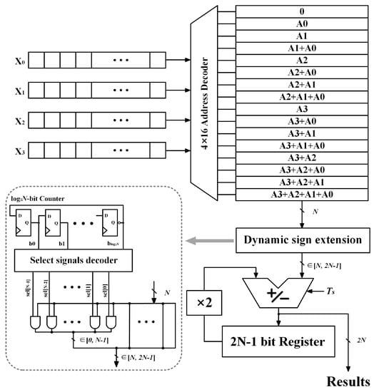 Figure 1 shows a detailed example of a DA computation. This structure consists of a look-up table with bits, each of the look-up table entries has corresponding registers storing input data, which are repackaged to form the memory address, most significant bit (MSB) first. The low right shows a sign extension block and -bit accumulator. The N-bit data fetched from the look-up table is scaled to -bit with -bit sign extension. The accumulation register adds two times of its previous value to the current look-up table contents every clock cycle. The signal is activated when the read-only memory (ROM) is addressed by the first bit of input data (sign). In this case, the adder subtracts the current ROM contents from the accumulator state. After N clock cycles, the -bit computation result is generated.