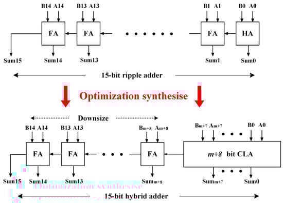 By replacing the ripple adders with CLAs, the overall area of the circuit is increased. The area overhead can be reduced by downsizing some gates that do not affect the circuit accuracy. For instance, according to Figure 6, a 15-bit accumulator is required for an 8-bit computation, where m full adders are inactive when computing the most significant bits. In such a case, these m adders can be downsized while the circuit can still at least obtain an -bit accuracy. Thus, during the gate downsizing phase, we firstly identify the inactive gates based the given accuracy specification. We denote as all gates that do not affect the result of MSB. The gates of are then replaced by those having the same functions but smaller dimensions. Accordingly, the path delay distribution can be modified with the synthesis approach, example cases with and are presented in Figure 7.