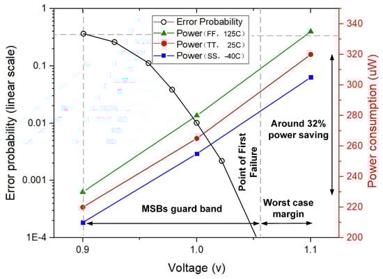 Because the simulation results of power consumption and computation accuracy are dependent on the input samples and the coefficients, random stimulus is implemented over the full input dynamic range. The power consumption savings in our proposed FIR filter are shown in Figure 9 under different circumstances of slow-slow (SS), typical-typical (TT), fast-fast (FF) corners, and −40 C, 25 C, 125 C. Compared with the TT process corner, 25 C, and 1.2 V supply voltage, the proposed approach achieves , , and power savings for best (SS corner, −40 C), nominal (TT corner, 25 C) and worst (FF corner, 125 C) cases, respectively (at 1.00 V). When the voltage is reduced to 0.90 V, a maximum power reduction of up to can be obtained. To better present the trade-off between the power consumption and computation accuracy, the error probability () serves as the measurement metric to evaluate the accuracy loss, which means it is probable that the output of computation differs from the correct one. Figure 9 also shows the error probability versus supply voltage, starting from the nominal 1.10 V, which includes the full worst-case design margin. If this margin is removed in the nominal case (TT, 25 C) using DVS, high-accuracy operations can still be retained. The point of first failure (PoFF) occurs at 1.06 V, where the paths from the LSB group start to fail, but the corresponding error rate is extremely low. Beyond 0.90 V, MSBs paths also begin to fail, which leads to a rapid decline in computation accuracy.