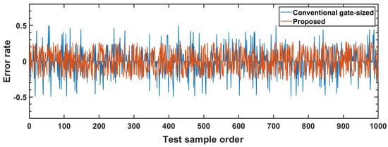 To implement a tentative comparison, the conventional DA-based design is up-sized to achieve the same hardware cost as the proposed one. Hence, more timing guardband is provided via gate sizing for the conventional design. The error rate comparison between the gate-sized conventional and proposed design with 0.9 V supply voltage using 1000 test samples can be seen in Figure 10. The conventional gate-sized design would suffer from more than accuracy loss some time while at least computation accuracy can still remain using the proposed error-mitigation method.