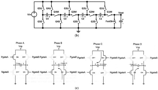 For a specific value of VREF, one of the mode selection signals is automatically enabled according to the selection rule in Table 1, and all other mode signals are disabled. The structure of the proposed multi-mode charge pump is shown in Figure 1b. The operation mode is determined by the gate voltages applied to the transistors at the charge pump through Gate Control module in Figure 1a. It should be noted that the charge pump output voltage VDC in Figure 1a is determined by the voltage divider and the feedback regulator [,]. With the voltage divider ratio chosen as 1/5, the output voltages VDC and VAC (RMS) are 5 times as large as the input voltage VREF regardless of the charge pump operation mode []. The multi-mode charge pump in Figure 1a simply provides a wide range of output voltages.