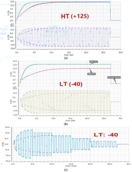 (a) The simulation results of the LC driver output (bottom curves) and the charge pump outputs (The top curve in blue in the FF corner and the top one in purple in the SS corner) at high temperature (125 °C); (b) The simulation results of the LC driver output (bottom curves) and the charge pump outputs (The top curve in blue in the FF corner and the top one in purple in the SS corner) at low temperature (−40 °C); (c) The driver output voltage generated in response to staircase control voltage (above) at low temperature (−40 °C).