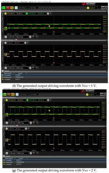 The output driving waveforms from one of the channel testing results with two different input control voltages are displayed in Figure 3f,g. The waveforms indicate that the output voltage in RMS is amplified to be 5 times as large as the input voltage. The output square wave’s frequency is about 1 kHz.