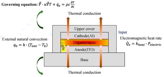 To investigate the thermal effect in OLEDs, the governing mechanisms of heat dissipation, including conduction between layers, conduction at the electrodes, convection between the OLED and the environment, and radiation from the OLED are considered in the thermal sub-model. The types of thermal dissipation for each OLED layer along with their equations are shown in Figure 1.