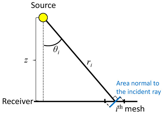 The optical sub-model of an OLED is constructed to investigate its lighting performance, including the luminous flux, illuminance at a target plane, luminous intensity distribution, etc. Because such performances relate to the far-field characteristics of the device, the propagation of light is modeled approximately using geometrical ray-tracing. Similarly to the thermal sub-model, the lamination of multiple organic materials with sub-micron thicknesses is regarded as one integrated organic layer in the optical sub-model. In order to increase the modeling accuracy, the Fresnel equations are applied for those refractive interfaces, while the diffuse scattering is calculated for the reflective cathode according to Lambert’s cosine law. The refractive index, thickness, and optical property of each layer of the example device are listed in Table 1. In order to quantify the total out-coupling luminous flux, a far-field spherical receiver is built herein. The light-extraction efficiency (ηLEE), defined as the ratio between the out-coupling light power and the power that is emitted from the organic layer, can then be calculated. To analyze the luminous intensity and illuminance distributions, a flat receiver positioned 1 m away from the organic layer is constructed in the form of square mesh. The dimensions of the flat receiver are 5.5 m × 5.5 m, leading to an analyzable range of luminous intensity between 70° and −70°. Once the flat receiver acquires the illuminance data of every mesh, the illuminance of the ith mesh, Ei, can be converted into luminous intensity, Ii. Consider a ray emits from the source toward the ith mesh, as shown in Figure 2. Assume that ri is the distance between the source and the ith small mesh whose area is dAi, and θi is the angle of incidence for the ith mesh. Then the projected area of the ith mesh on to the surface normal to the ray can be counted as dai = dAi · cosθi. According to the radiometry, the luminous flux through the ith mesh is Ei · dAi = Ii · dai / ri2. A conversion formula is then derived as follows: