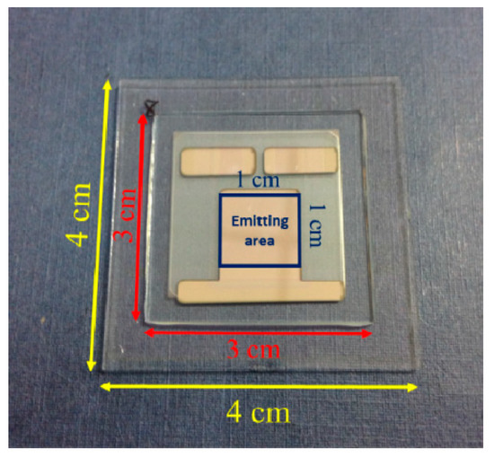 Green phosphorescent OLEDs were fabricated by the conventional processes to demonstrate the proposed model experimentally. Firstly, the glass substrate was coated with the ITO, which was then etched to form the patterned anode. Next, the multiple organic layers were evaporated onto the patterned ITO, followed by the evaporation of the Al/LiF cathode. Finally, the glass passivation was allocated above the cathode, and glue was used to seal the sample. Among the organic layers, the essential green emitter was the combination of WPH-401 and WPGD-831 fabricated by Shine Materials Technology Co. Ltd. The dimensions are listed in Table 1, and the emitting area is 1 cm2, as shown in Figure 3. Eight samples were made via the same process with identical parameters for the following investigation.