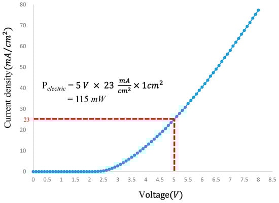 The current-voltage (I-V) curves of the OLED samples were measured using a semiconductor device analyzer (Keysight B1500A). In laboratorial experiments, even the same run of the process practically produces samples with a certain discrepancy. Thus, the measured results of the eight samples were then averaged and converted to a current density-voltage (J-V) curve by counting the emitting area, as shown in Figure 4. This shows that when the operation voltage is 5 V, the average current and input electrical power are 23 mA and 115 mW, respectively. In this example, these parameters are then used as input values for the proposed model.