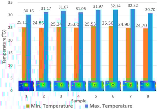 Measured temperature distributions of each sample. The red region in the temperature map is corresponding to the emission area of each sample with the dimension of 1 cm × 1 cm.