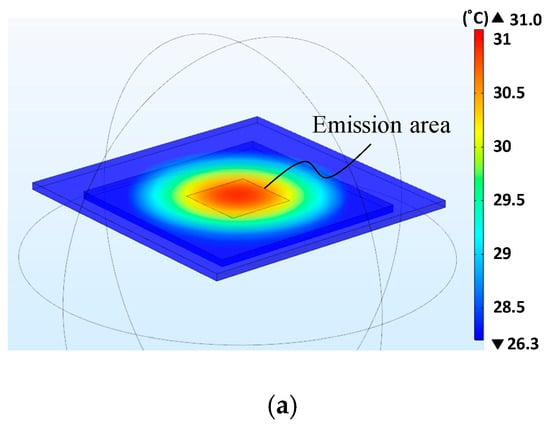The aforementioned embodiment of the proposed model considered the structure and the parameters according to our available experimental resources. The model, though, can be utilized for other diverse conditions. A bottom-emission OLED with a desiccative layer between the Al cathode and the upper cover is taken as another example. Assume that the desiccative layer is 500 μm in thickness and filled with the nitrogen gas (N2), and the configurations of other layers are the same as aforementioned embodiment, as shown in Figure 9a. Based on the proposed modeling approach, the simulation results show that such a N2 gap brings about the maximum temperature of 33.8 °C at the upper cover, equivalent to ~2 °C higher than that of the one without N2. The reason of the temperature increment lies in the low thermal conductivity of N2, which reduces the dissipation rate of the generated heat. Then the heat accumulates in the device and causes the higher maximum temperature of the upper cover. The modelled result has reflected such a phenomenon, as shown in Figure 9b. As for the optical performance, the OLED with the N2 gap shows no significant change in simulation, compared with the one without N2. That is because those emitting rays propagating toward the N2 gap are all blocked by the Al cathode. Besides structures or configurations, OLEDs operated in altered surrounding conditions, such as a hot, cold or windy environment, can also be analyzed by the proposed model with appropriate parameters, including the ambient temperature, the convection coefficient, etc. Consequently, the proposed model is exploitable for various applications like automotive lighting and street lighting.