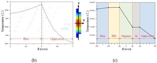 Simulated temperature distributions (a) on the upper cover glass and (b) along the central cross-section, and (c) an enlarged graph of (b). The emission area is 1 cm2 corresponding to the OLED dimension shown in Figure 3.