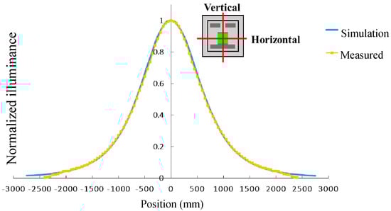 The illuminance distribution of every sample was measured by means of a digital lux meter (TES 1330A). A flat screen was utilized as a receiver at a distance of 1 m away from the sample. The emission surface of the sample, represented by the insert of Figure 7, was oriented parallel to the screen and the centers of the sample and screen were coaxial. The illuminance was measured along the central horizontal and central vertical axes on the screen. The solid curve in Figure 7 shows the normalized average of the measured data along these two axes, and the dashed curve represents the simulated illuminance after normalization. The simulated illuminance distribution agreed closely with the measured data, while a difference was noted at distances of more than 2 m away from the screen center. Because the measured illuminance beyond this distance is lower than 0.01 lux, which is beyond the accuracy of the lux meter that was used, the error is attributed to the precision of the instrument. Additionally, although the demonstrated measurement was done for an OLED with a small emission area, it is also applicable to a large surface light by extending the distance between the light source and the flat screen. Such a distance is suggested be to at least 20 times of the diameter of the emission area to geometrically restrict the angular discrepancy within 1.5°.