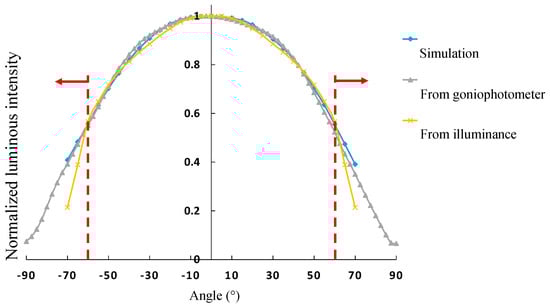 On the other hand, a goniophotometer (AMA LID-100) was applied to directly measure the intensity distribution. The solid line in Figure 8 provides an average intensity distribution measured along the zero-latitude and zero-longitude directions, referring to photometry type C. Additionally, from the measured illuminance distribution, the luminous intensity distribution was calculated, shown by the dashed line in Figure 8. Using the proposed model, the simulated luminous intensity distribution was obtained, represented by the dotted line in Figure 8. The curves in this figure have all been normalized to facilitate comparison. Next, the beam angles were calculated from the goniophotometer measurement, illuminance measurement, and simulation to be 127°, 124°, and 130°, respectively. The simulated curve largely agrees with the experimental data, except for instances with half angles more than ~60°. Since the locations where the discrepancies between the measured and simulated illuminances occurred are at half angles of greater than 63°, this discrepancy in intensity distribution is also attributed to the precision of the lux meter. On the whole, since the measured and simulated results are largely consistent with each other, the proposed model for investigation of illumination is acceptable.