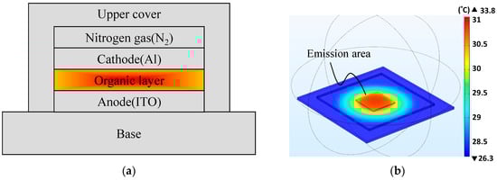 Another embodiment of the OLED with a desiccative layer filled with N2. (a) Schematic representation of structure, and (b) simulated temperature distributions on the upper cover glass.