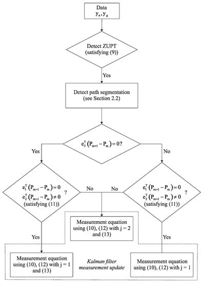 Two measurement equations are used in the Kalman filter: the zero velocity updating (ZUPT) equation and the map matching equation.