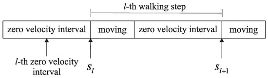 To apply map matching measurement Equation (12), a current path must be identified. Using the zero velocity intervals, each walking step can be easily determined. Let be the discrete time index of the end of l-th zero velocity interval (see Figure 3).