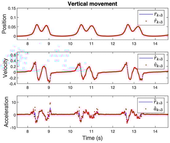 In [,,], IMU simulation data are generated using optical motion capture data for human motion estimation. In [], IMU simulation data is generated for walking motion by approximating walking trajectory as simple sinusoidal functions. In [,,], IMU simulation data are also generated for flight motion estimation using an artificially generated trajectory. There are many different methods to represent attitude and position simulation data. Among them, the spline function is the most popular approach []. The B-spline quaternion algorithm provides a general curve construction scheme that extends the spline curves []. Reference [] presents an approach for attitude estimation using cumulative B-splines unit quaternion curves. Position can be represented by any spline function []. Usually, position data are represented using cubic spline functions. The cubic spline function gives a continuous position, velocity, and acceleration. However, the acceleration is not sufficiently smooth. This is a problem for the inertial sensor simulation data generation since the smooth accelerometer data cannot be generated. Thus, we use the eighth-order spline function for position data since it gives position data with smooth acceleration, whose jerk (third derivative) can be controlled in the optimization problem.