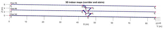 Figure 8 shows the walking along a 3D trajectory results with a waypoint is the starting point whose coordinate is . The coordinates of waypoints to are known, and the starting waypoint coincides with the end waypoint on the projection plane. The routes are as follow: starting from the third floor waypoint , walking along the floor to collect data with normal speed then turning in and turning on the right in , then going up the stairs through the floor by the same way as the other floors, finally reaching the fifth floor waypoint , after that turning and walking along the floor to coming back the starting waypoint . The total length of the path line is approximately 562.98 m.