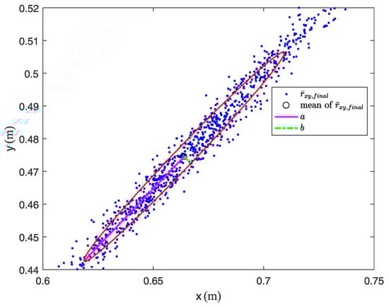 The accuracy of an algorithm can be evaluated from the distribution of . Consider an ellipse whose center point is the mean of and which include 50% of (see Figure 9). Let a be the length of the major axis and b be the length of the minor axis. Smaller values of a and b indicate that the error of a certain algorithm is smaller.