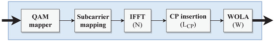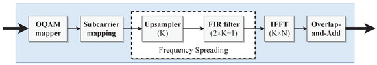 Due to its sinc-pulse shapes transmission, OFDM does not provide genuinely band-limited signals, and the high side lobe power levels can cause unwanted interference with adjacent spectrum bands. FBMC achieves better spectral containment by filtering each subcarrier individually. This eliminates the need for a guard interval like the cyclic prefix and contributes to a higher spectral efficiency. Quite often, the improved spectral efficiency of FBMC systems comes at the cost of relaxed signal orthogonality. In these cases, Offset QAM (OQAM) is employed to ensure real-part orthogonality of FBMC symbols: OQAM-FBMC. In this work, FBMC modulation (Figure 2) follows the approach from [30], where frequency spreading is applied before the IFFT. The frequency spreading operation, which is characterized by the overlapping factor , comprises an up-sampler module and an FIR filter with non-zero coefficients. Due to the frequency spreading operation, the waveform synthesis is performed with an IFFT of size , where is the number of subcarriers. Finally, IFFT output blocks are overlapped and added to create an FBMC output multi-carrier symbol.