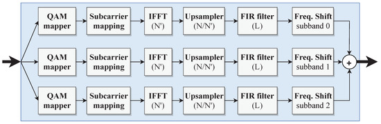 UFMC is a waveform with better out-of-band suppression than CP-OFDM and a better multi-antenna compatibility than FBMC [28]. This multi-carrier scheme divides the available subcarriers that represent the whole frequency band into blocks of subcarriers—Physical Resource Blocks (PRB)—that represent individual sub-bands. Usually, only a part of the PRBs is used for transmission: active PRBs. Then, for each active PRB, IFFT and bandpass -order FIR filtering are performed. The same filter can be applied to all sub-bands, but its center frequency must be shifted. At the end, the filtered sub-bands are superimposed to form the UFMC symbol to be transmitted. The classic UFMC modulation scheme from [31] considers an -point IFFT and frequency-shifted FIR filters with complex coefficients for each sub-band. To counteract this increased computational complexity, Knopp et al. [29] proposed an algorithm that combines a reduced size -point IFFT with upsampling and keeps real-valued coefficient FIR filters by performing frequency shifting after filtering (Figure 3).