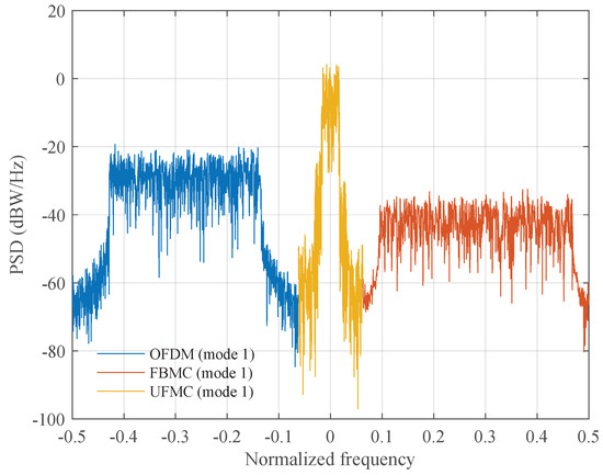 The transition from 4G to 5G will not be as abrupt as in previous generations. Instead, 5G should enable the coexistence and tight interworking between different radio access technologies in order to facilitate the gradual penetration of 5G systems [2]. Thus, the waveform numerologies adopted in our work are based on the 4G LTE standards. In particular, OFDM Modes 1 and 2 correspond to LTE 5 and 10 channelizations, respectively. Like [18], we assume that a primary user communicates using OFDM and that secondary users opportunistically transmit using OFDM, FBMC, or UFMC. Thus, the numerologies for FBMC and UFMC should be compatible with the OFDM numerologies. Table 1 presents the modes of operation and numerologies supported in this work, and Figure 4 depicts the combination of periodograms for Mode 1 OFDM, FBMC, and UFMC baseband signals, in what would be a scenario where these waveforms coexist by sharing a portion of the spectrum band. In all cases, the 16-QAM constellation scheme was used for digital modulation.
