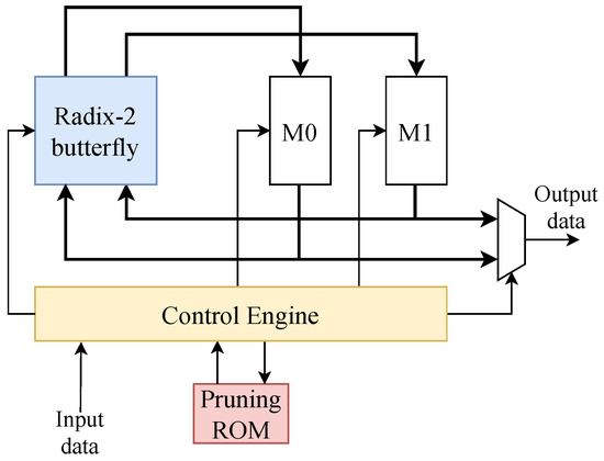 The memory-based IFFT architecture implemented is depicted in Figure 5, and its main constituent elements are: a control engine, a Radix-2 butterfly unit, two -element memory banks (M0 and M1) and a ROM memory used to control IFFT pruning (pruning ROM). Due to the DIF algorithm employed, IFFT results are not produced in natural order. Therefore, a reordering unit is attached to deliver IFFT output results in natural order to the subsequent datapath modules. The operation of the IFFT module can be divided into two phases: load input/unload results and process transform. During the load input/unload results phase, the control engine issues read/write operations on M0 and M1 to fill the memory banks with the incoming data samples, while forwarding the results from previous transform processing to the reordering unit. The process transform phase corresponds to the execution of the processing steps of each Radix-2 IFFT processing stage. The control unit fetches values from M0 and M1 to the butterfly unit that performs a processing step. Then, the results are stored back in M0 and M1. In this architecture, the control engine uses a binary counter to generate all the signals to control the butterfly unit and memory bank addressing. We adopted the butterfly structure and address generation scheme from [33] and further extended the architecture to support IFFT pruning. The complex multiplier used for twiddle factor multiplications was implemented with three real multipliers, one adder, and two subtractors.