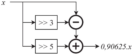In these circumstances, we adopted a multiplier-less architecture for FIR filtering where FIR coefficients in the Q1.5 format are represented using the Canonic Signed Digit (CSD) system with minimum non-zero bits. Multipliers are then substituted by shift-and-add graphs. As an example, for a coefficient equal to 0.90625, we have: