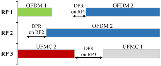 Reconfiguring the communication mode of operation would typically be carried out at the control plane. An ITU-R report about technical performance specifications for 5G radio interfaces recommends control plane latencies below 10 [43]. Therefore, the latencies observed in our architecture are acceptable. Nonetheless, in critical, high-priority scenarios, our architecture allows a make-before-break approach to eliminate DPR latency: use a spare RP to load the new transmission mode before the old one is terminated. This is illustrated in Figure 8: OFDM Mode 1 communication carried out in RP1 has to be adapted to OFDM Mode 2; the idle RP2 is reconfigured to OFDM Mode 2 before communication using RP1 terminates. Then, the communication handover from RP1 to RP2 is not affected by the DPR latency.