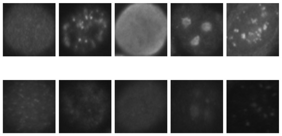 HEp-2 cell images datasets usually contain six cell types: homogeneous, centromere, nucleolar, fine speckled, coarse speckled, and cytoplasmic. The images shown in Figure 1 were taken from the SNPHEp-2 dataset, which does not contain the cytoplasmic type. They typically contain two levels of fluorescence intensity, positive and intermediate, which sometimes can lead to a preliminary intensity-based separation that precedes the cell type classification itself, as proposed by Nigam et al. [31].