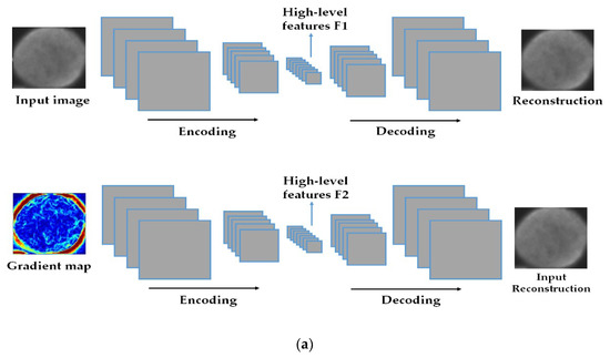 The encoding–decoding scheme of the DCAEs requires a symmetric architecture in the two parts of the network. This means that both the encoder and decoder will have the same size and volume, and every single down-sampling layer in the encoder must have its corresponding up-sampling layer in the decoder. Because the image and its gradient map have the same size, we have used the same architecture for both DCAEs.