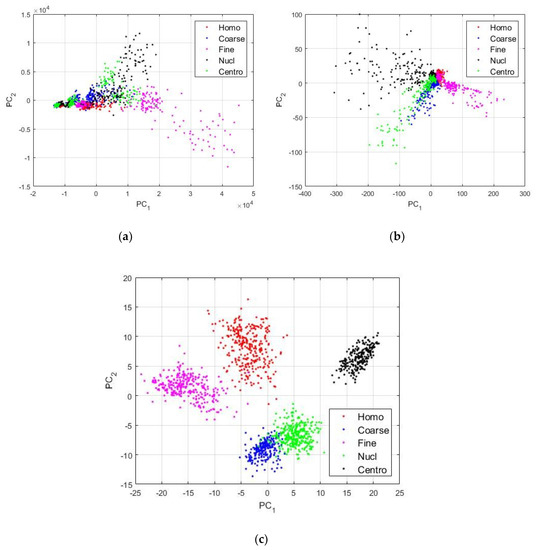 In Figure 4, we can see the different images showing the projections of the final vectors constructed by merging the latent representations learned by the two DCAEs. The projections were obtained using the principal component analysis [39]. PC1 and PC2 denote the first and second principal component axis, respectively. For all the figures, “Homo”, “Coarse”, “Fine”, “Nucl”, and “Centro” denote the homogeneous, the coarse speckled, the fine speckled, the nucleolar, and the centromere types, respectively. In Figure 4a, we have the features constructed by using the first convolutional layers of the two networks. We called them the low-level features, because they are located right at the beginning of the networks where no meaningful features were yet learned. We can notice how the different types of the cells are mixed together. The fine speckled cells (shown in magenta color) exhibited very different patterns, as we can also remark in Figure 1, explaining why some of them were clustered away from the other types. In Figure 4b, we show the features that were learned by the third convolutional layers of the two DCAEs. We can see how both networks have already learned some distinguishable features from the data, as the different clusters started to become clearer, compared to the projections shown in Figure 4a.