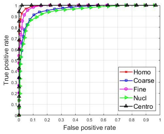 The classification results are partially shown in Figure 5, where we present the receiver operating characteristic (ROC) curves for the classification of each one of the cell types. For each cell type, the ROC curves were evaluated by considering the concerned cell type as a positive class, and all the remaining types were considered as the negative class. For example, the ROC curve of the homogeneous cells was computed by considering the homogeneous images as being from the positive class, and all the remaining cells, the four other types, as being from the negative class. The curves show how the network manages to recognize every single cell type.