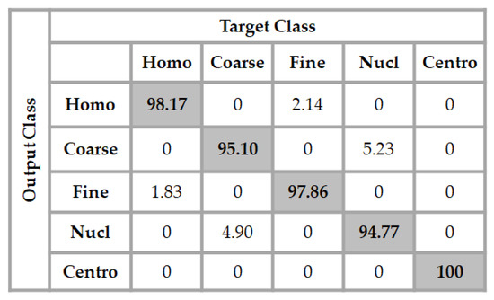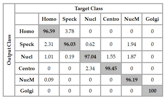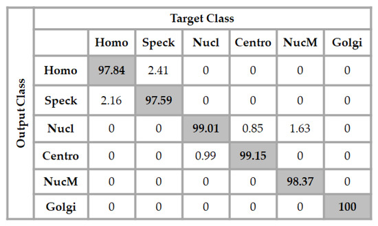 We can remark in the results shown in Figure 10 that the network slightly decreased the confusion between the homogeneous and the speckled cells, and also between the centromere and the nucleolar. All of the Golgi cells were still well-recognized by the network and, moreover, any confusion between the nuclear membrane and the speckled cells disappeared, and the total accuracy of the network was 98.66%.