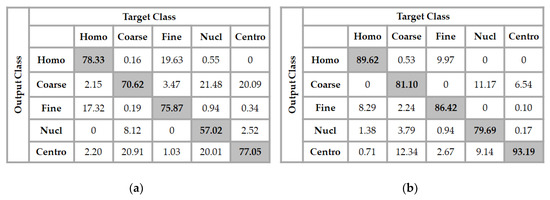 An interesting comparison is made in Figure 7, where we show the results obtained using the features learned by the two DCAEs, but separately. In Figure 7a, we have the results using the features from the DCAE that takes as inputs only the original cellular images. The architecture of the classifier was set to be 512-50-10-5, which means that we have used two hidden layers, the first one having 50 neurons and the second one, 10 neurons. Here, the input layer has 512 neurons because one single DCAE outputs a feature vector of 512 dimensions. As we can see in Figure 7a, by computing the mean accuracy of all the classes, the network achieves a total accuracy of 71.77%.
