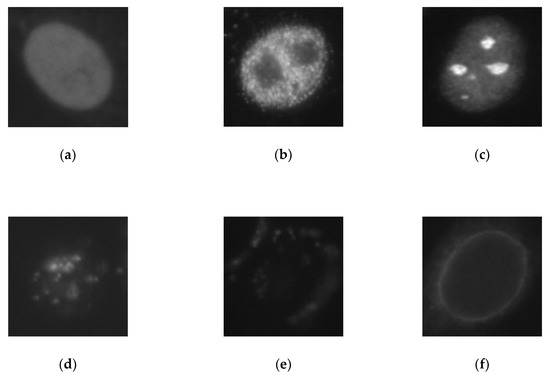 Examples of HEp-2 cell images from the ICPR 2016 dataset. In (a–f), we have, respectively, the homogeneous, the speckled, the nucleolar, the centromere, the nuclear membrane, and the Golgi.