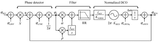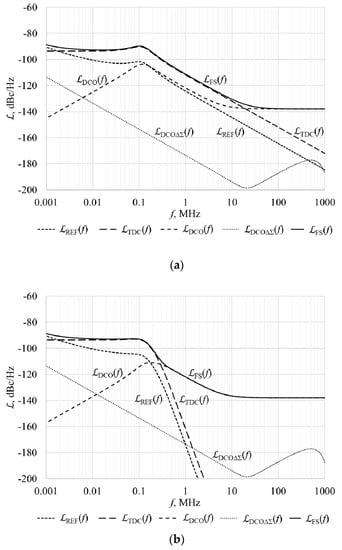 where Hcl,REF, Hcl,TDC, Hcl,DCO, are respectively closed-loop transfer functions of reference signal noise, TDC quantization noise and oscillator’s component of DCO noise, whose s-domain representations are shown in Equations (5)–(7) [15]. Expression of ΔΣ quantization noise, shown in Equation (3) takes into account its noise transfer function, therefore it is not multiplied by the power transfer function in Equation (4).