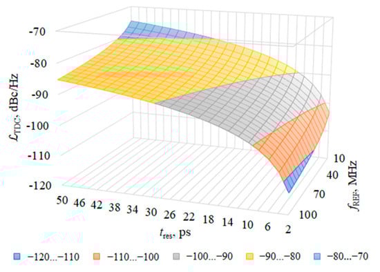 From Equation (1) it is seen that noise induced by TDC depends on the resolution of TDC, operating frequency of DCO and frequency of the reference signal. It deteriorates with a higher frequency of DCO, therefore, for theoretical calculations, the highest needed frequency should be used, i.e., 6 GHz. Calculated noise, induced by TDC, when frequency of digitally controlled oscillator is 6 GHz, frequency of reference signal ranges from 10 MHz to 100 MHz and resolution of TDC ranges from 2 ps to 50 ps is shown in Figure 3. As can be seen, the resolution of TDC has to be better than 12 ps to satisfy the in-band noise requirement of −90 dBc/Hz. If resolution of TDC is 4 ps, a better than −100 dBc/Hz in-band noise can be achieved.