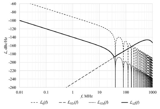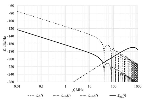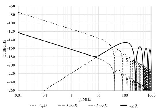 Figure 4 shows DCO’s quantization and ΔΣ shaping noise and its components, which are calculated by using Equation (3). The following parameters were used: DCO’s frequency fDCO is equal to 6 GHz, frequency of reference signal fREF is 40 MHz, ΔΣ dithering frequency fΔΣ is equal to divided-by-4 DCO’s frequency, DCO’s frequency tuning step ΔfRES is 50 kHz, ΔΣ modulator controls 8 bits and order of ΔΣ modulator is 3. Total DCO’s quantization and ΔΣ shaping noise is marked as ΔΣ(f), DCO’s quantization noise without ΔΣ modulator is marked as q(f), DCO’s quantization noise with ΔΣ modulator is marked as ΔΣq(f), and ΔΣ noise shaping component is marked as ΔΣs(f).