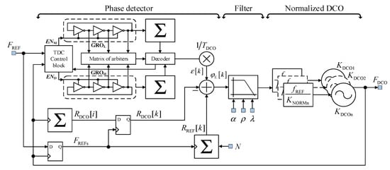 Wide tuning range is achieved by using multicore DCO. In this structure it is shown as multiple parallel-connected DCOs, because in the general case, there can be n DCO cores used in synthesisers, but simultaneously only one core is operating. Each core has its own normalisation coefficient KDCOn, therefore, general DCO’s normalisation coefficient is a set of coefficients of each core KDCO = {KDCO1, KDCO2, ..., KDCOn}. Each core is normalised individually, therefore there are n normalisation blocks. The purpose of normalisation is to eliminate the transfer coefficient of the DCO (KDCO) and make a tuning of DCO linear—if transfer coefficient of the DCO is estimated correctly (i.e., normalisation transfer coefficient KNORM is equal to KDCO and ratio KDCO/KNORM = 1), due to normalisation, change of one bit of integer oscillator tuning word (LSB) changes the output frequency of DCO by fREF hertz.