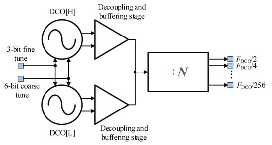 Physical implementation of multicore DCO in 0.18 μm CMOS technology is presented in our previous work [26] and shown in Figure 8. It made of two LC tank DCO cores, decoupling stage, differential to single ended converter, tri-state buffers and frequency divider. It is a partial case of a multicore oscillator, where two DCO cores are used, but this structure is scalable to use different a number of cores to satisfy operating frequency and tuning range requirements. However, the penalty of adding more cores is a rapidly increasing area of silicon.