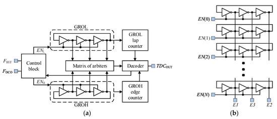 (a) Structure of proposed 2D Vernier time to digital converter based on gated ring oscillators. GROL—lower frequency oscillator, GROH—higher frequency oscillator; (b) Structure of gated ring oscillators used in TDC.