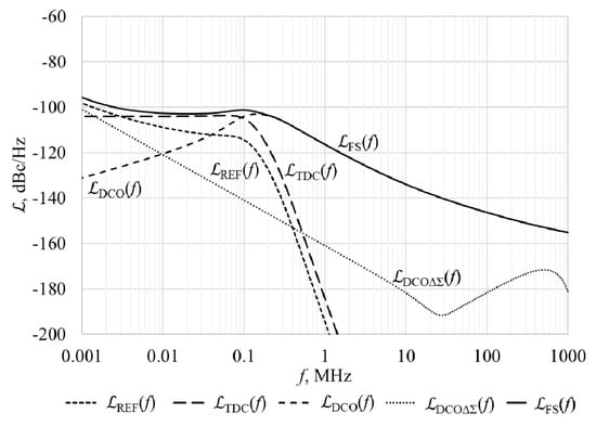 Calculation results of phase noise and its components of type-II frequency synthesiser are shown in Figure 2. Total phase noise of frequency synthesiser is marked as FS(f), phase noise induced by reference signal is marked as REF(f), phase noise induced by TDC is marked as TDC(f), the oscillator’s component of DCO’s phase noise is marked as DCO(f), DCO’s quantization and ΔΣ shaping noise is marked as DCOΔΣ(f). Parameters provided in references [16,17] were used to carry out these calculations: the operating frequency of the DCO is equal to 5.38 GHz, the frequency of the reference signal is 48 MHz, the frequency tuning step is 26 kHz, the ΔΣ modulator controls 9 bits. The ΔΣ dithering frequency and order of ΔΣ modulator are not provided, therefore we assume that the ΔΣ dithering frequency is equal to the DCO’s frequency divided by 4, and the order of the ΔΣ modulator is 2nd. Phase noise of the reference signal and oscillator’s component of DCO’s noise are approximated respectively by Equations (9) and (10).
