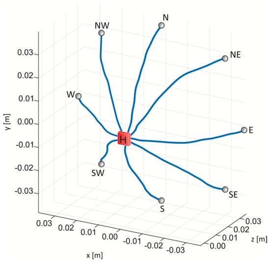 Representation of the 3D trajectories performed by the subjects from the home-base (H) to the 8 different targets (grey dots). The applied forces were always directed from the targets to the home base thereby changing the direction as soon as the subject moved the end effector in a different direction.