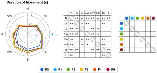 Looking at the Duration of Movement index (Figure 3), we can note that differences occurred across directions (p < 0.01) and that no differences occurred among the forces. In particular, the trajectories in N direction occurred with lower Duration of Movement values than the others. The W, NW, NE and E trajectories had similar duration values, and the S, SW and SE trajectories displayed higher values of Duration of Movement.