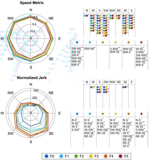 In particular, the greatest differences among force field amplitudes were found for W, S, SW, SE and E trajectories, especially between the lower force fields (F0, F1, and F2) and the higher ones (F3, F4, F5). Considering directions as the independent variable, differences occurred for all of the force fields, with the exception of F2. More specifically, the tasks in which the largest number of differences between directions occurred were F0 and F5. Looking at the results of the Normalized Jerk, statistical differences were found across movement directions (p < 0.01) and forces (p < 0.02), and the interaction factor was significant (p = 0.04). Considering force as an independent variable, differences between F0 and the other force levels were found for W, S, SW and SE. Considering direction as an independent variable, differences were noted between trajectories in the upper quadrant and those in the lower one for all the force levels.