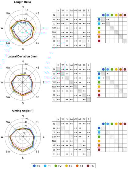 Regarding the accuracy indices (Figure 5), statistical differences for Length Ratio were found in movement directions (p < 0.01) and forces (p < 0.01). The trajectories in N, NW and NE directions showed lower values of Length Ratio than the others. The highest values of Length Ratio were found in the S trajectories. W, SW, and SE showed similar values of Length Ratio. Focusing on force amplitude, Length Ratio values were lower in the trajectories performed without a force field than in the trajectories with a force field F1. Focusing on Lateral Deviation, statistical differences were recorded among movement directions (p < 0.01) and forces (p = 0.02). The trajectories performed with lower values of Lateral Deviation were those in the N direction. In contrast, S, SW and SE were characterized by the highest values of Lateral Deviation. Considering variations across force fields, a statistical difference was observed between F0 and F1. In terms of Aiming Angle, differences were found across movement directions (p < 0.01). More specifically, Aiming Angle was lower in N, NW, and NE directions than in other directions.
