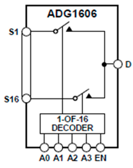 The next part of our PCB circuit selected two of the outputs of the 16 EPIC sensors using two ADG1606 analog multiplexers (see Figure 4). By making use of four control signals (A0, A1, A2, and A3), we could select 1 of the 16 inputs (S1–S16), which was transmitted to the output D. Therefore, we needed eight signals to select a sensor.