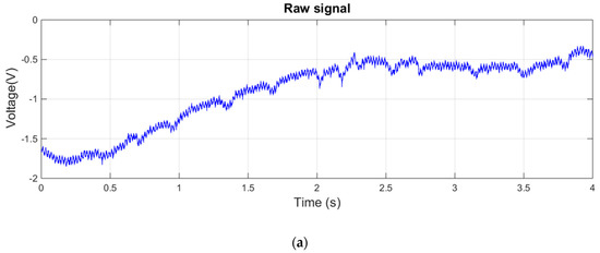 Figure 7a shows an exemplary result for a captured raw physiological signal while the mouse had one limb in contact with an EPIC sensor. Figure 7b shows the result after notch filtering the raw signal.