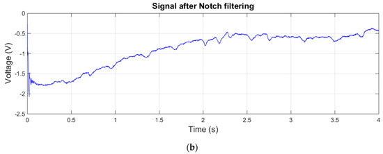 Physiological signal obtained while the mouse had one limb in contact with an EPIC sensor of the matrix: before (a) and after (b) the notch filter.